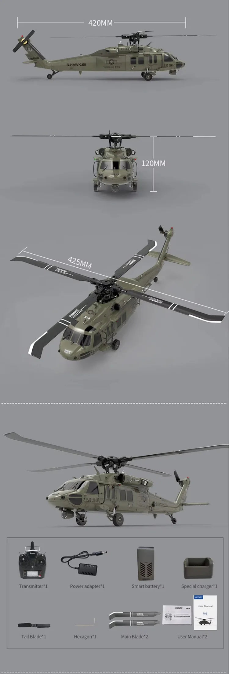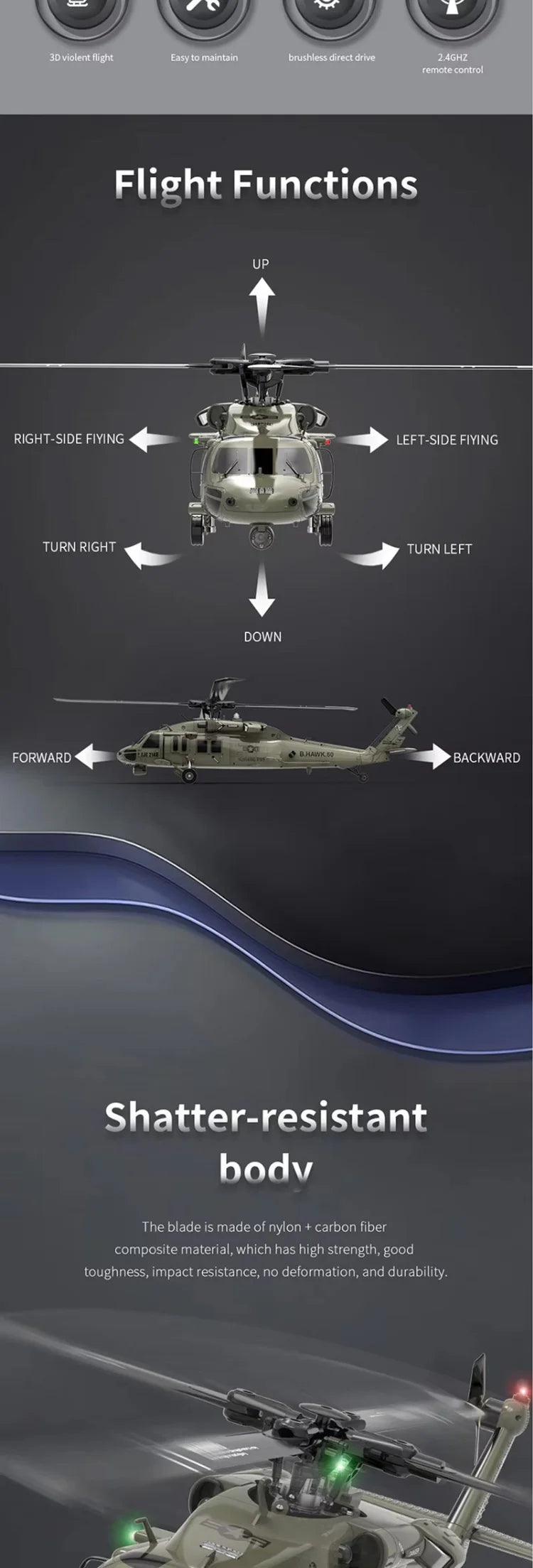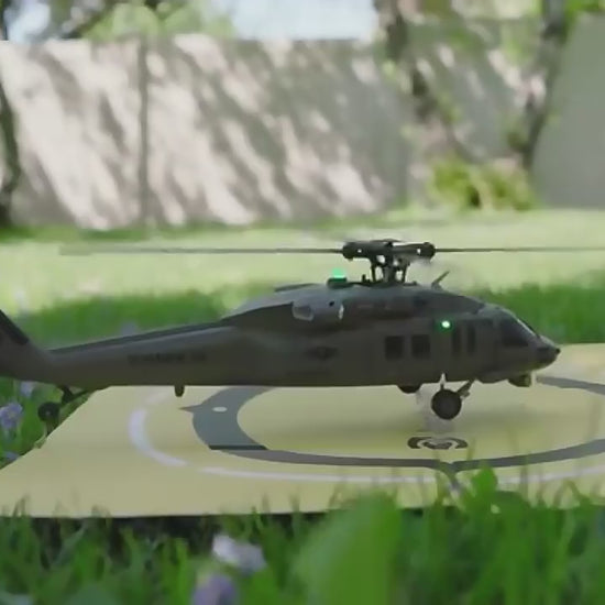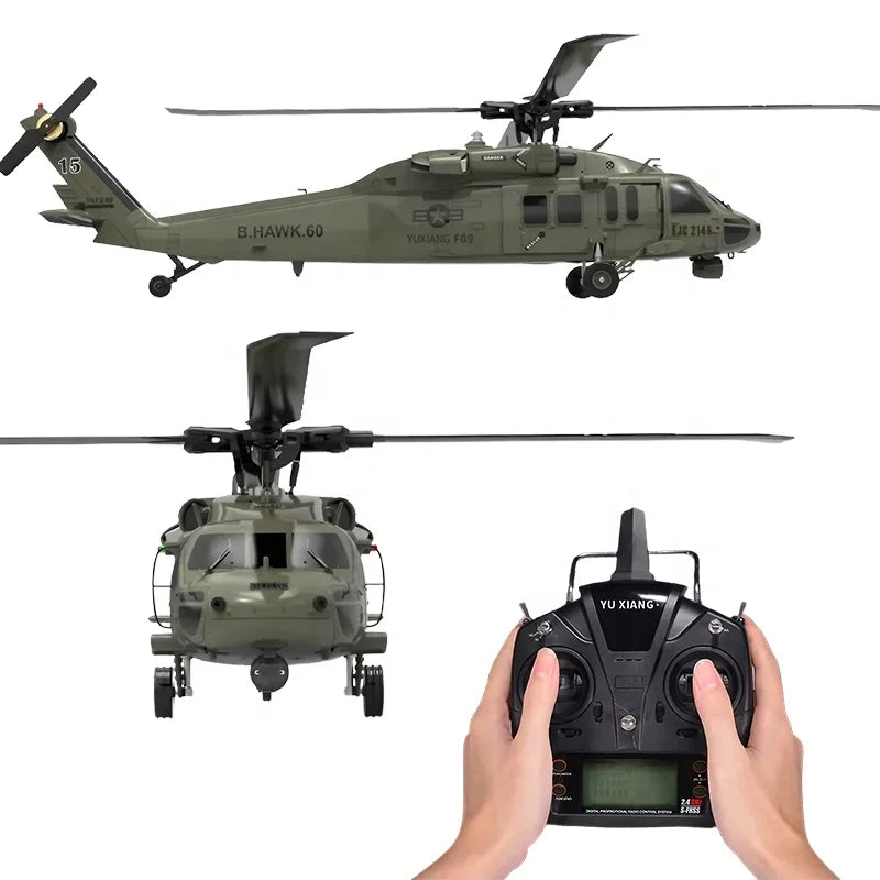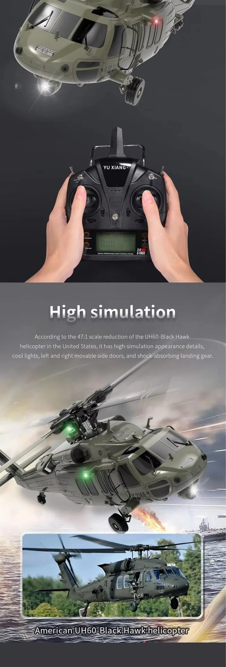 The YUXIANG YXZRC F09 Black Hawk Helicopter is a high-simulation RC aircraft, modeled after the UH-60 Black Hawk. Featuring a 2.4 GHz remote control, six-axis gyroscope for stable flight, dual brushless motors for enhanced power, and a flybarless design, this helicopter is built for both 3D flight and durability. The shatter-resistant body is made of high-strength composite materials. It also includes detailed features like movable side doors, shock-absorbing landing gear, and a high precision CNC rotor head for smooth operation.