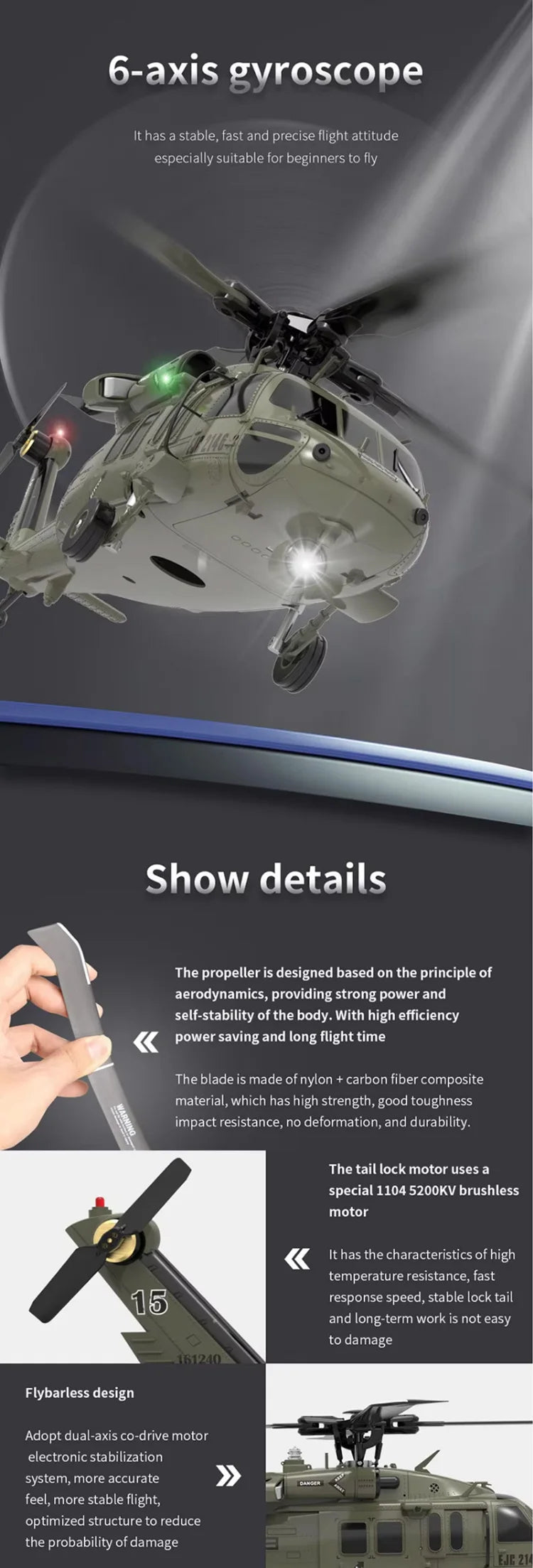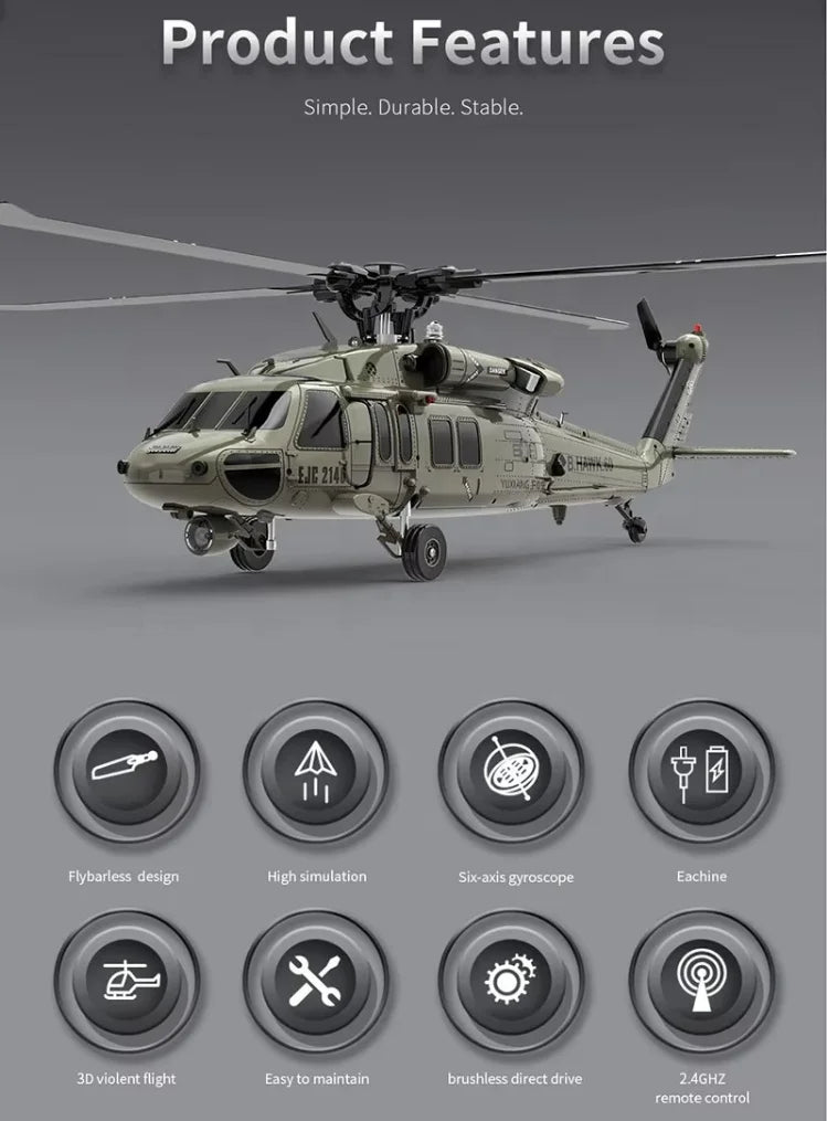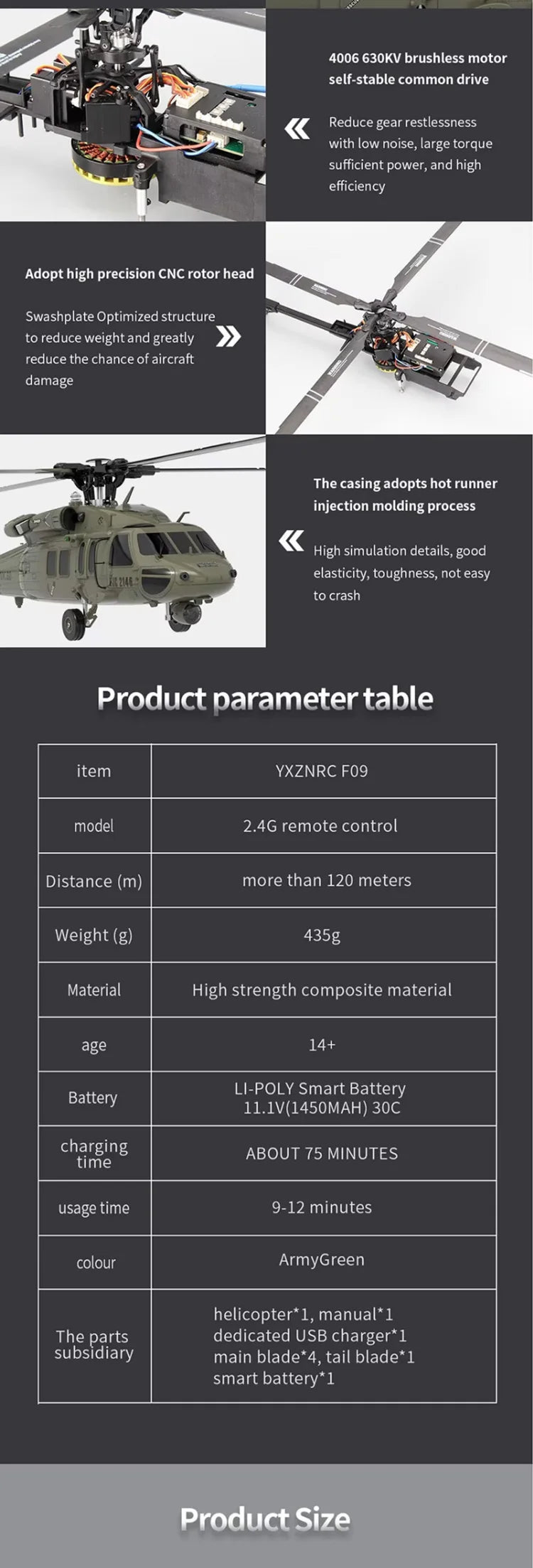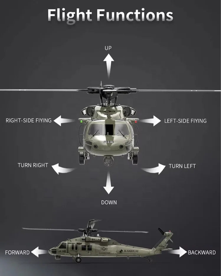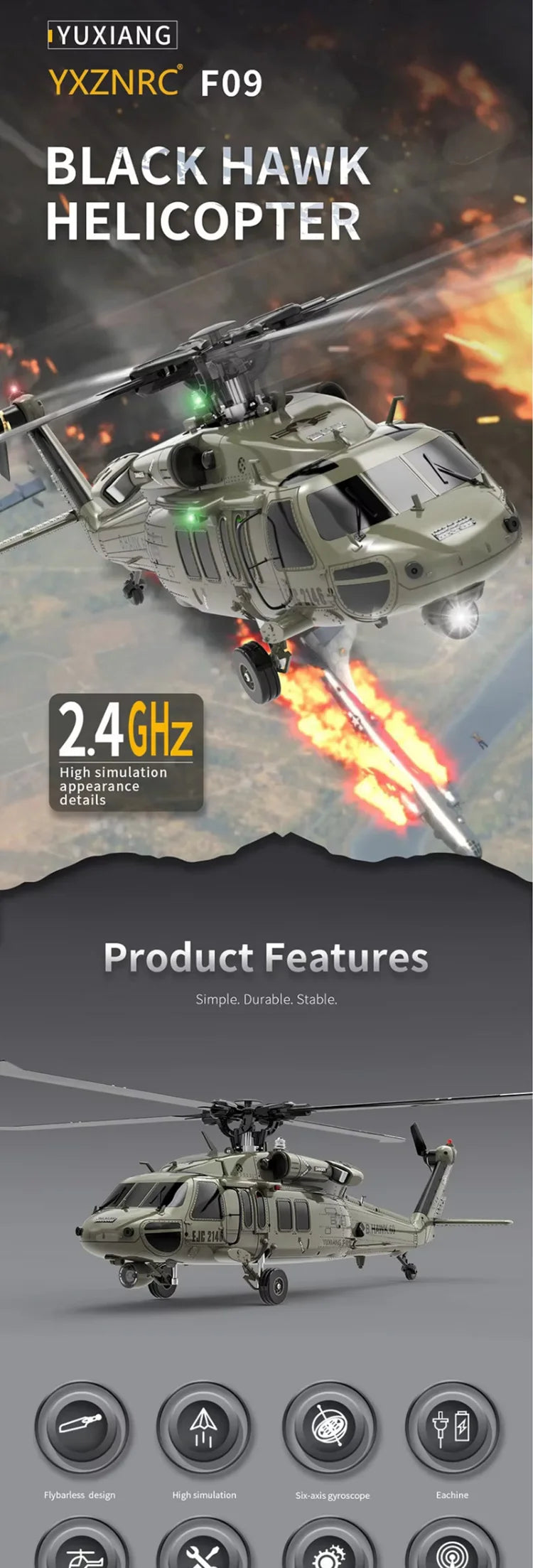 The YUXIANG YXZRC F09 Black Hawk Helicopter is a high-simulation RC aircraft, modeled after the UH-60 Black Hawk. Featuring a 2.4 GHz remote control, six-axis gyroscope for stable flight, dual brushless motors for enhanced power, and a flybarless design, this helicopter is built for both 3D flight and durability. The shatter-resistant body is made of high-strength composite materials. It also includes detailed features like movable side doors, shock-absorbing landing gear, and a high precision CNC rotor head for smooth operation.