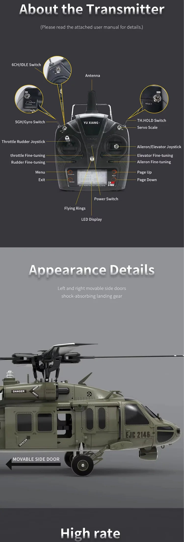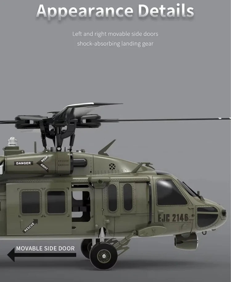 1. Scale down of the U.S. UH 60 Black Hawk helicopter with 47:1 scale. With high simulation appearance details, cool lights, left and right movable side door, and shock absorber of landing gear.