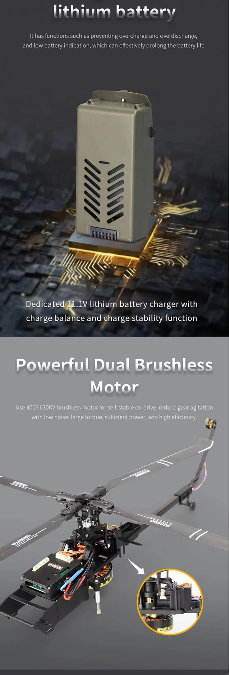2. It adopts flybarless design, double shaft driving motor and electronic stability enhancement system, which makes the hand feel more accurate, the flight more stable, optimizes the structure and reduces the probability of damage.