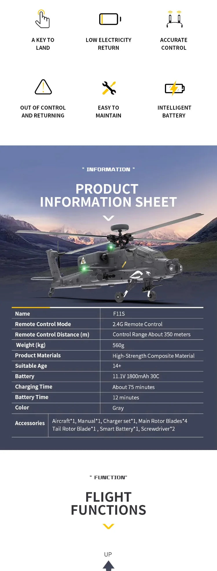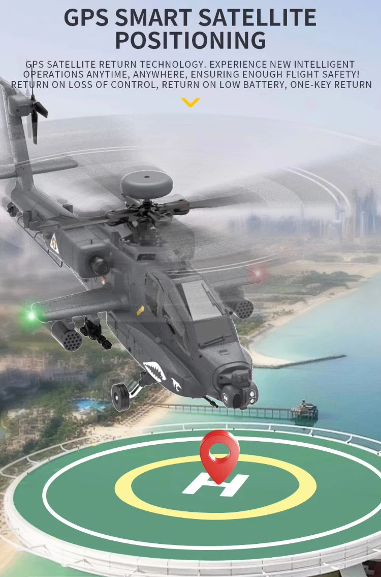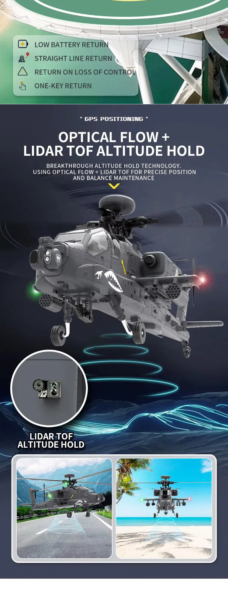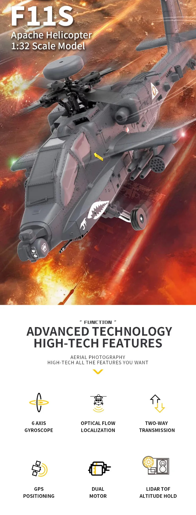 This F11-S (AH-64D) 3D/6G Apache RC helicopter is a highly detailed, 1:32 scale replica with advanced features like GPS stabilization, LiDAR altitude control, and an 8-channel 2.4GHz transmitter. The helicopter has a brushless motor for superior torque and efficiency, carbon fiber propellers for durability, and multiple flight modes for precision control. It also supports real-time telemetry, has an intelligent flight controller with one-key return, and can fly up to 300 meters with a 10-12 minute flight time.
