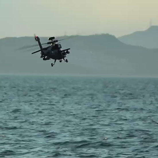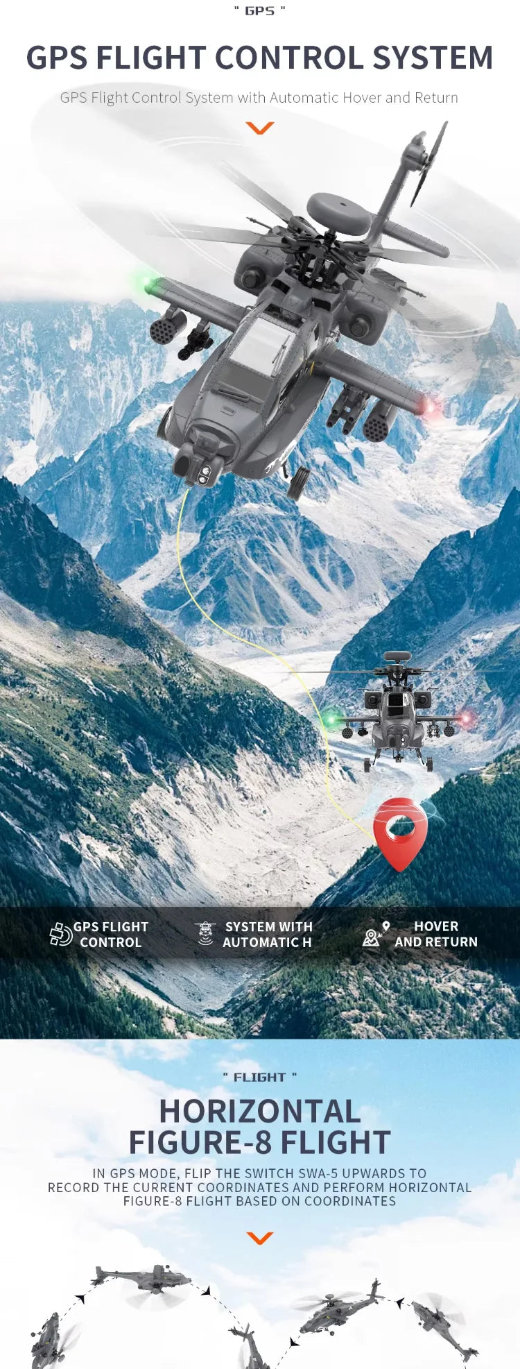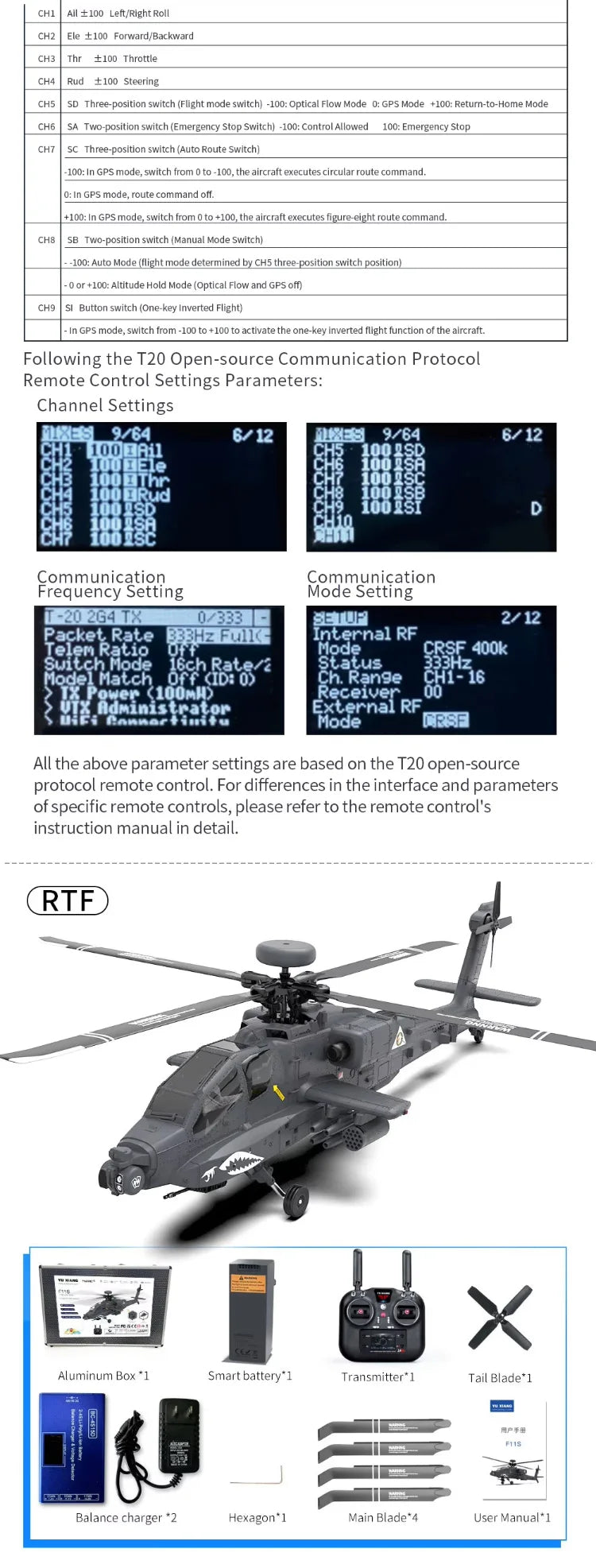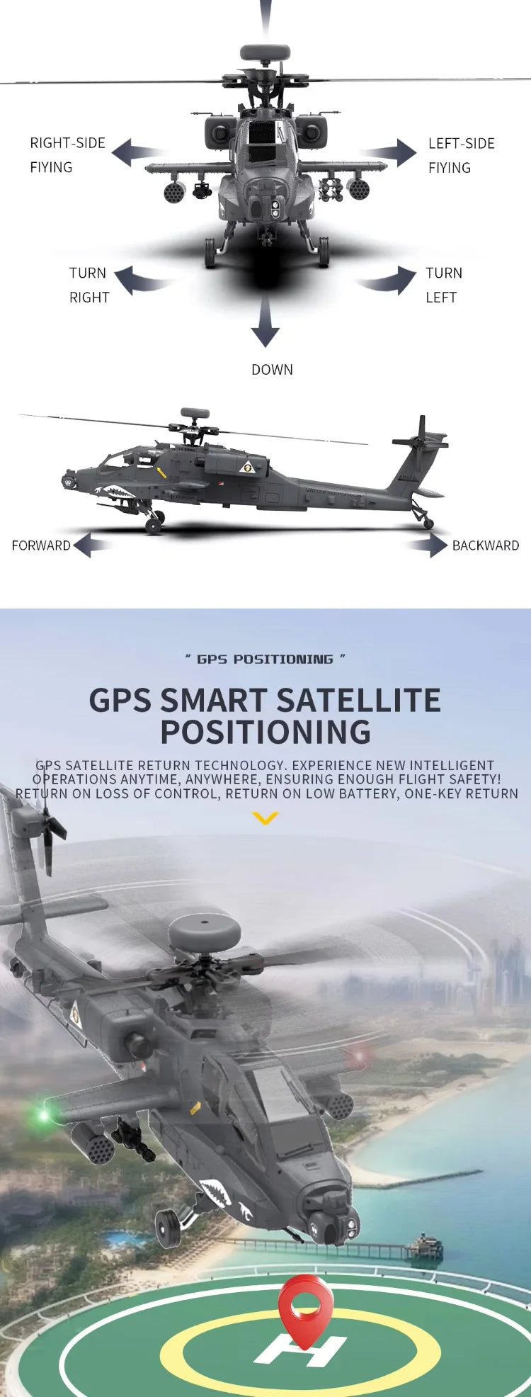 This F11-S (AH-64D) 3D/6G Apache RC helicopter is a highly detailed, 1:32 scale replica with advanced features like GPS stabilization, LiDAR altitude control, and an 8-channel 2.4GHz transmitter. The helicopter has a brushless motor for superior torque and efficiency, carbon fiber propellers for durability, and multiple flight modes for precision control. It also supports real-time telemetry, has an intelligent flight controller with one-key return, and can fly up to 300 meters with a 10-12 minute flight time.