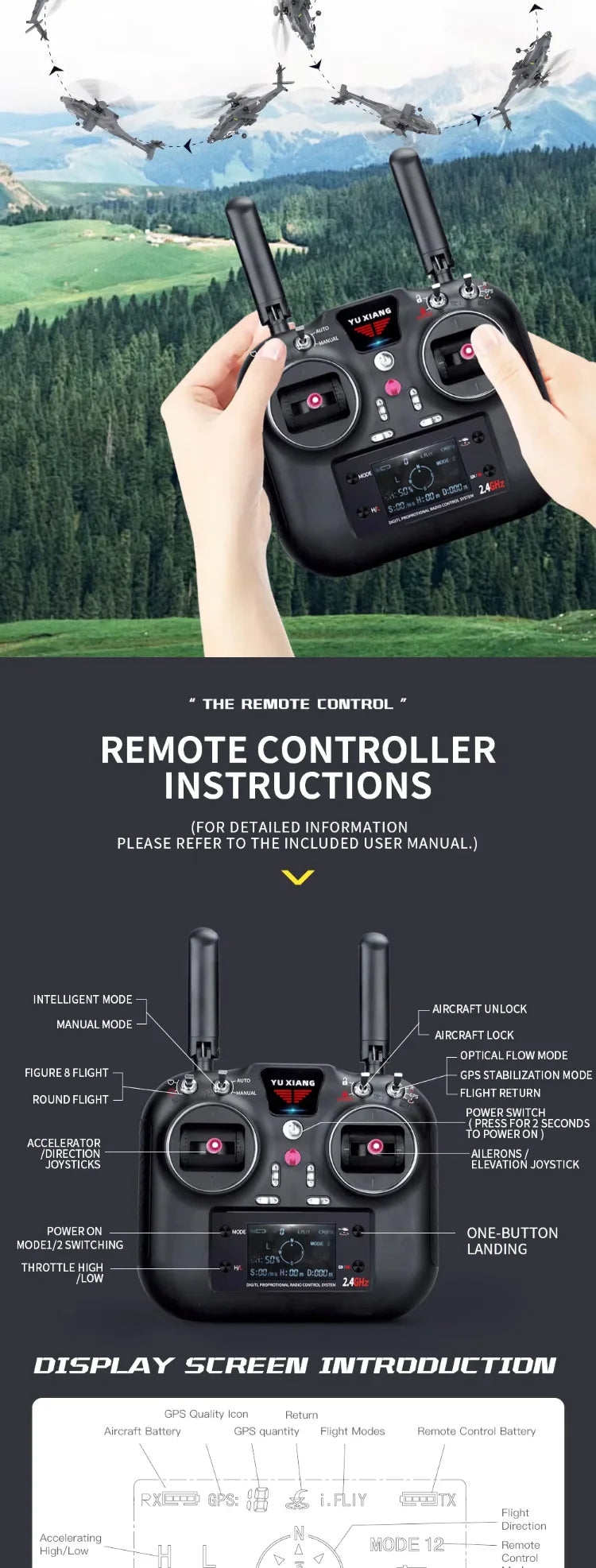 10. 8-Channel High-Precision Transmitter: 2.4GHz bidirectional communication, 1024 levels of control, HD display, real-time feedback on battery, speed, altitude, distance, direction, and GPS satellites for precise control.