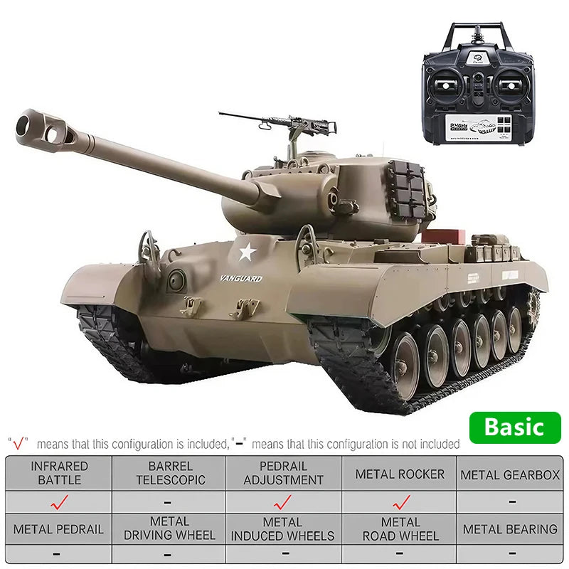 Professional: Metal rocker arms, Infrared combat system, Steel gearbox, Metal drive wheels, Metal idler wheels, Metal tracks, Metal road wheels, Full wheel bearings, Barrel retraction