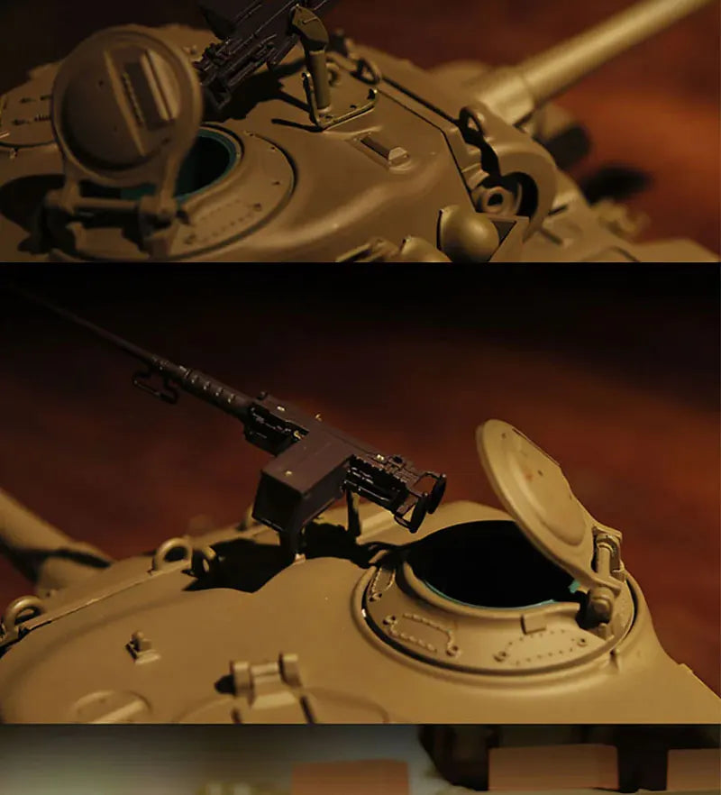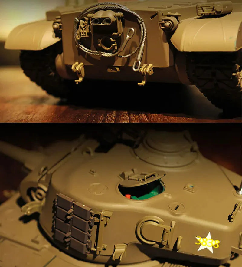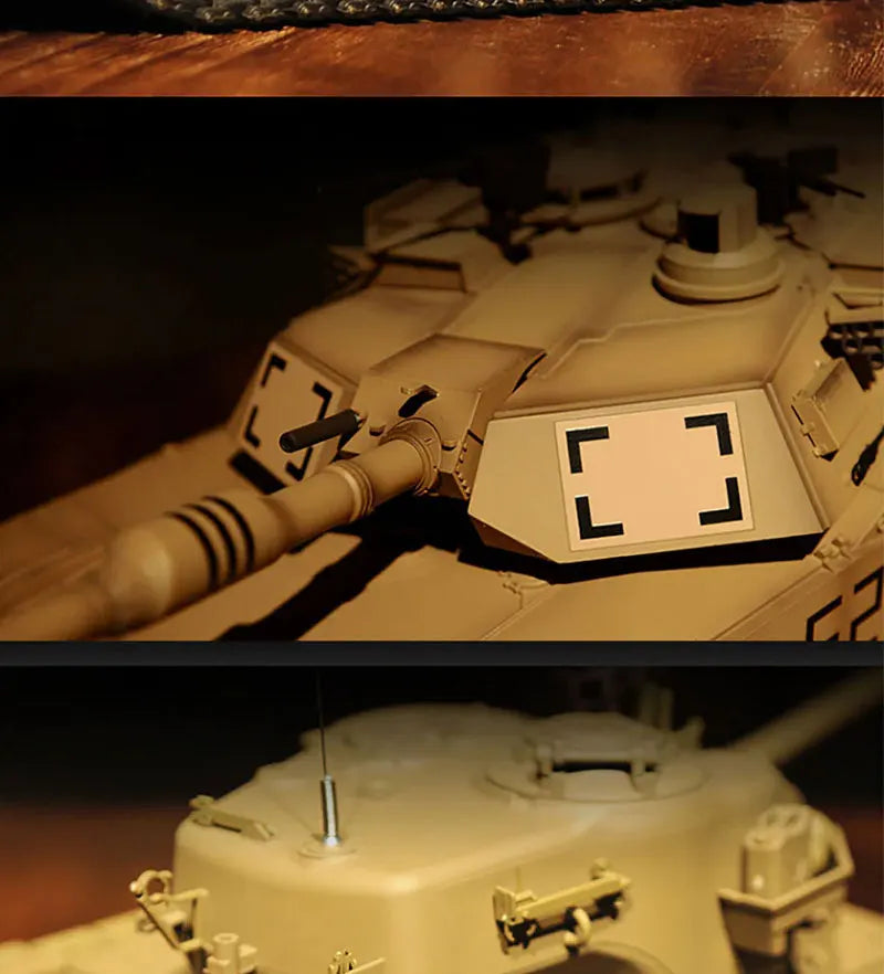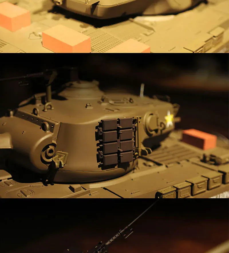 Stepless speed control for forward and backward, ultra-precise rotation, recoil demonstration, 320° turret rotation, 30° barrel elevation, realistic sound and action effects, full proportional remote control, smoke effect, independent suspension, realistic commander figure.